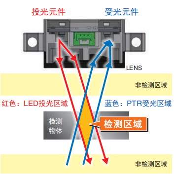 歐姆龍新推出傳感器B5W(原理如圖)是一款不易受顏色和材質影響的限定反射型。 鏡面、黑色、透明物體也都會檢測出來限定位傳感器,檢測范圍廣,因此耐物體位置偏移強不易受外部干擾影響。接受來自檢測物體的反射光以檢測物體有無,擁有限定了投光光束和受光區域的光學系統。支持DC24V的設備內置用,憑借由4種超環面透鏡組成的歐姆龍自行設計的結構,只需微弱的光即可實現穩定檢測。