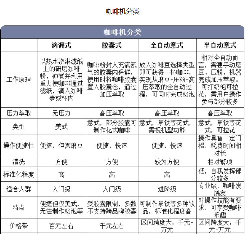 人們把電子技術(shù)應(yīng)用到咖啡機(jī)上,實(shí)現(xiàn)了磨粉、壓粉、裝粉、沖泡、清除等釀制咖啡全過(guò)程的自動(dòng)控制,創(chuàng)造了咖啡機(jī)。具體分品類來(lái)看,咖啡機(jī)根據(jù)萃取方式可主要分為滴漏式、膠囊式和壓力式(意式),根據(jù)工作方式可分為全自動(dòng)和半自動(dòng)(區(qū)別在于半自動(dòng)需要消費(fèi)者掌握一定的咖啡技能,磨豆、壓粉、打奶泡等多項(xiàng)步驟需手動(dòng)參與)。