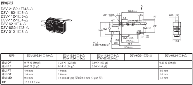 | 擺桿型 | 內(nèi)部安裝 | 1.23N {125gf} | D3V-162-1□5-△ | D3V-162-2□5-△ | D3V-162-3□5-△ |