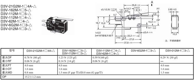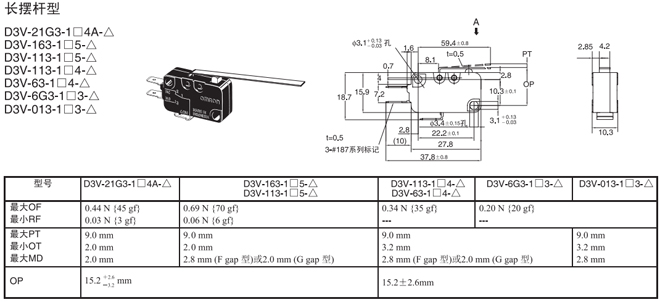 | 長擺桿型 | 內(nèi)部安裝 | 0.44N {45gf} | D3V-21G3-1□4A-△ | D3V-21G3-2□4A-△ | D3V-21G3-3□4A-△ |