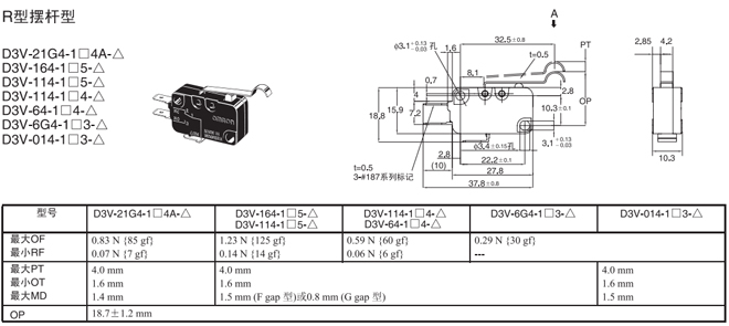 | R型擺桿型 | 內(nèi)部安裝 | 1.23N {125gf} | D3V-164-1□5-△ | D3V-164-2□5-△ | D3V-164-3□5-△ |
