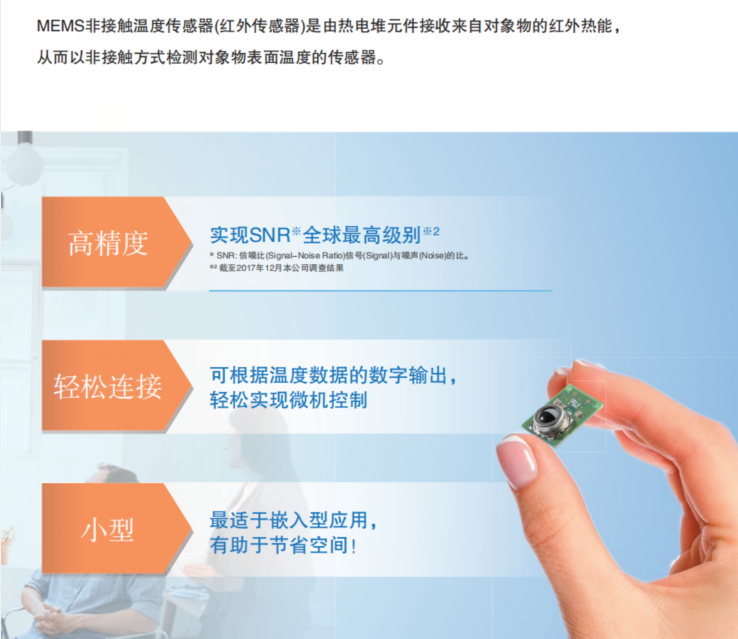 對靜止人物也能檢測高靈敏度的人體感應(yīng)傳感器 通過使用自制的MEMS、ASIC,達到了高水平的SNR。(D6T-32L-01A除外) 數(shù)字輸出,抗干擾性優(yōu)異。 通過低串?dāng)_的視野特性,實現(xiàn)更高精度的區(qū)域溫度檢測。