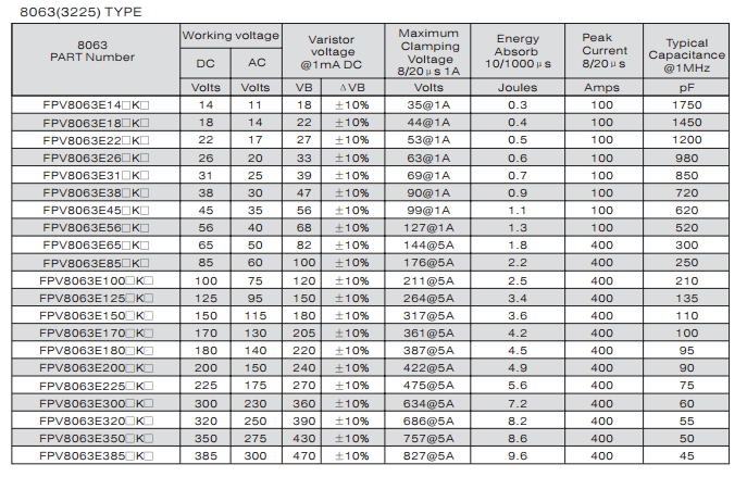 特征: 1、疊層片式陶瓷結(jié)構(gòu)。 2、無引線。 3、溫度范圍:-55℃~+125 ℃。 4、工作電壓范圍V w(dc)=3.3~ 615V。 5、具有雙向限制特性,適合ESD保護(hù)。 6、漏電流非常小。 7、寄生電感小、響應(yīng)速度快(響應(yīng)時間少于0.5ns)。 8、優(yōu)良的溫度系數(shù)。 9、良好的焊接性能(端電極為三層電鍍)。 應(yīng)用: 1、防止過電壓:當(dāng)施加的電壓升高到壓敏電壓時,壓敏電阻器的電流急劇上升,被保護(hù)設(shè)備的浪涌電壓迅速減小,從而使裝有壓敏電阻器的設(shè)備抗浪涌噪聲能力達(dá)到相應(yīng)要求。